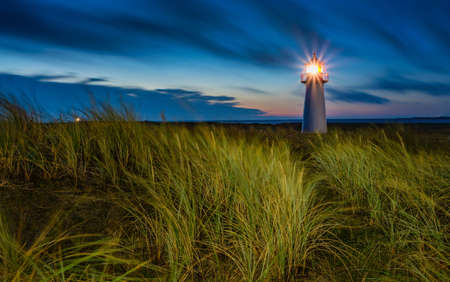 Nauset Lighthouse lantern shines brightly at dusk on a summer evening on Cape Cod, Massachusetts.