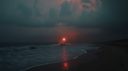 A captivating dark beach scene featuring a vibrant red sunset casting reflections on the gentle waves, creating a serene and tranquil atmosphere.