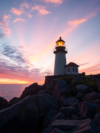 A stunning lighthouse positioned on a rugged cliff offers a breathtaking view of the calm ocean waters under a pastel sunset sky, embodying maritime beauty and tranquility.