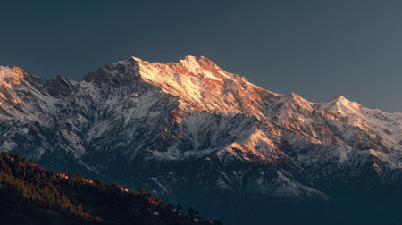 A mountain range is depicted, its peaks covered with snow and illuminated by sunlight. The scene features varying textures and contrasts, with the sky providing a backdrop. This composition may be suitable for various projects, from travel brochures to website backgrounds, providing a sense of grandeur.