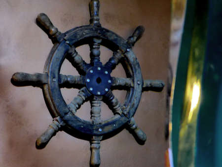 A wooden yacht helm with a toy sailboat on it on a textured light oak board surface