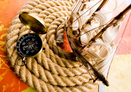 Sailboat, nauticalcompass and mooring rope on a wooden captain table background. Sea travel concept.