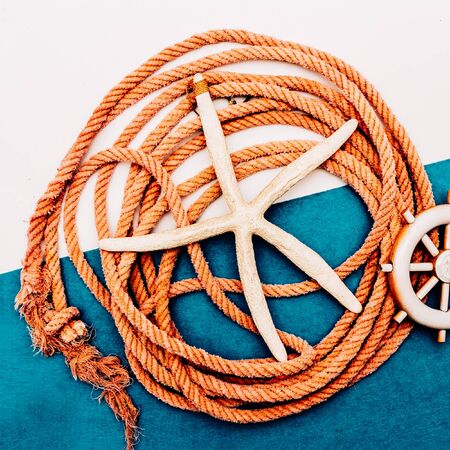 Nautical life style items: sea shells, fish, rope, lifebuoy. Marine concept.