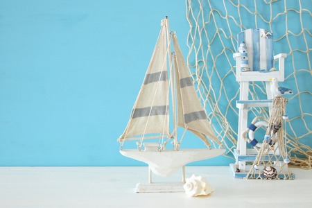 nautical concept with white decorative sail boat, seashells over wooden table and blue background