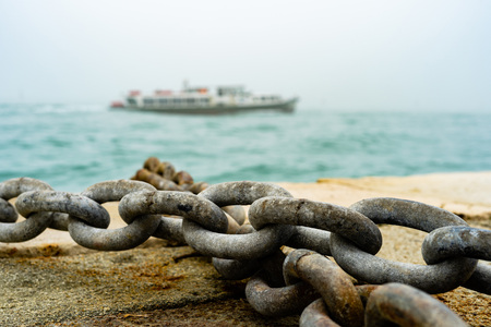The old chain by the pier at sunset. Defocused background with ship and dramatic sky. Space for text.