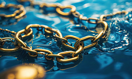 Close up of golden chain on blue water surface. Shallow depth of field.