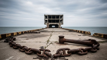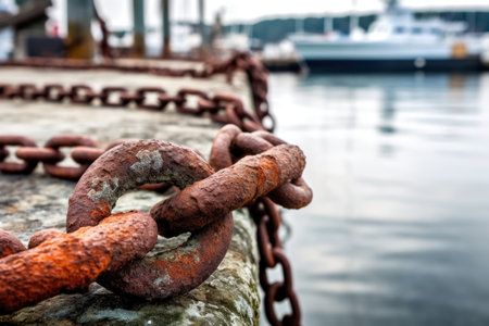 rusty chain links connecting to a weathered anchor on the dock, created with generative ai