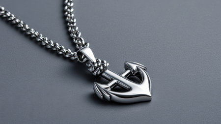 A necklace with an anchor on it sitting in front of a blurry background, AI