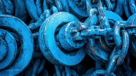 Close-up view of intertwined blue chain links featuring a textured surface, highlighting signs of wear and corrosion, perfect for industrial themes.