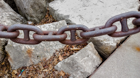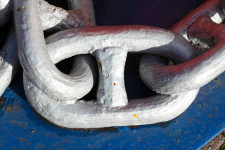 Closeup of a harbor s rusted thick anchor chain lying on the ground