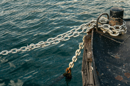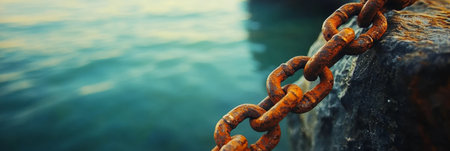 A close-up of rusty chains, neatly arranged on the edge of an industrial dock overlooking the sea and boats in the background. The warm sunlight casts long shadows over the chains' rough texture, highlighting their ruggedness against the blue water below. In sharp focus is one link, with rust streaks running across it, adding depth to the composition. This scene captures the essence of coastal commercial activity, emphasizing the strength of metal connecting ships to land. --chaos 30 --ar 16:9 --v 6.1 Job ID: 48f7754c-aba8-49af-8a98-7e683bef68d3