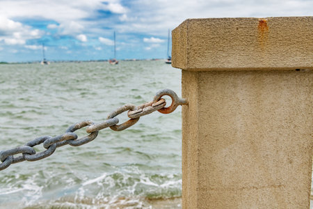 Waterfront safety chain attached to concrete post by the sea