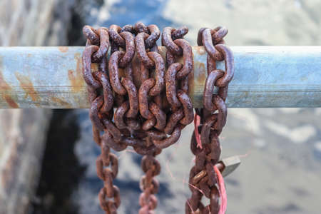 Rusty chain links over the water in a harbor