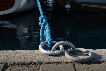 Marine mooring ropes on the pier of a yacht.