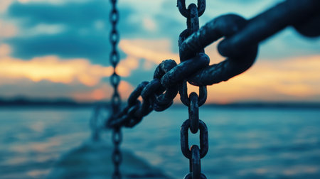 A close-up view of a weathered chain in soft focus, set against a tranquil water backdrop and vibrant sunset colors. An industrial touch to a serene scene.