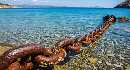 This image showcases a close-up view of a rusty metal chain on a pier, with a vibrant blue sea shimmering in the sunlight, creating an inviting coastal scene.