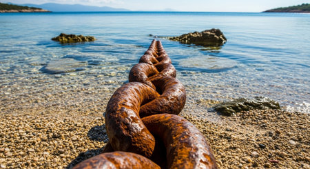 A rusty chain is attached to a rock by the water, AI