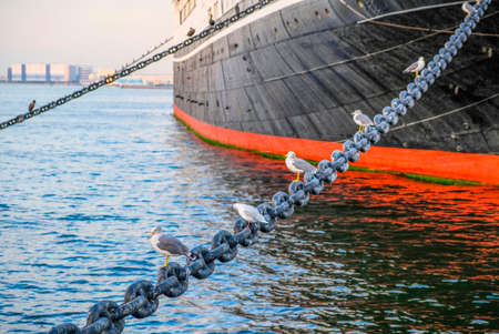 Seagulls on a metal chain on the background of a ship