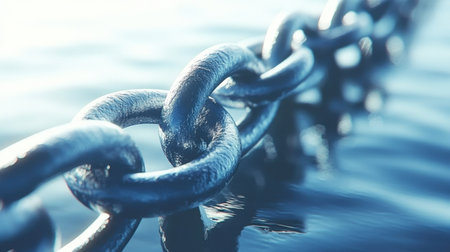 A captivating close-up of a metal chain above gentle water, showcasing its shine and detail, creating a peaceful and reflective atmosphere. Ideal for themes of strength and connection.