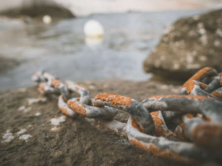 A selective focus shot of giant chains in the sea