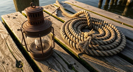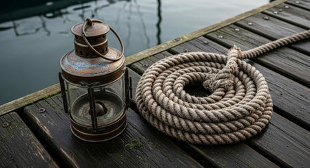 A textured marine cord snugly fastened around a glaming metal fixture, set against rugged wooden planks with restless sea waves whispering in the background.
