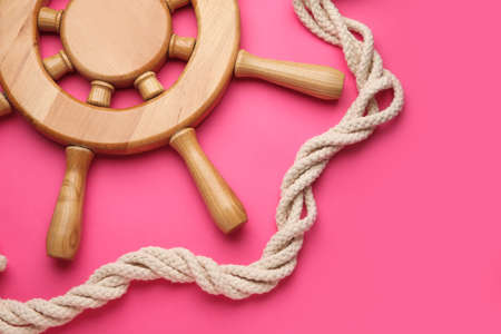 Marine attributes. Rope, frame, wooden anchor and steering wheel on a blue wooden background. Top view