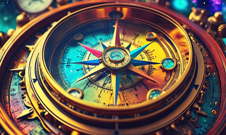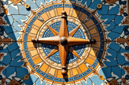 Ornate ceramic compass design with vibrant colors and intricate patterns. That the image is generated using AI.