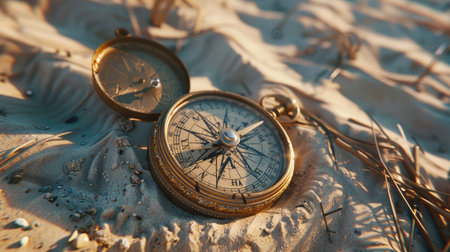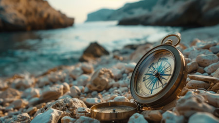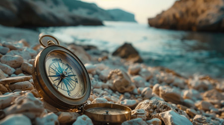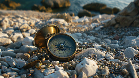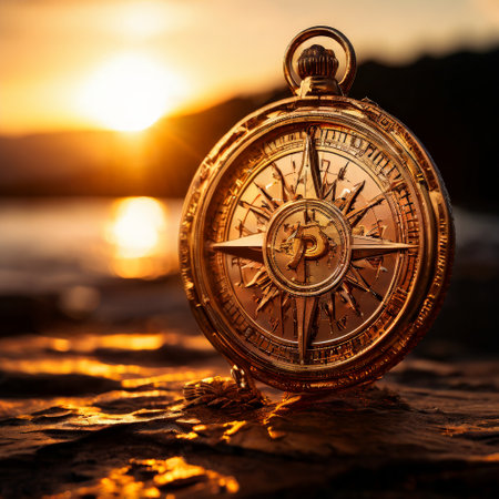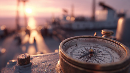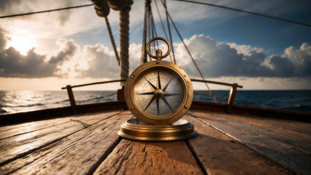 A compass on a ships deck captures the warm light of sunset. The sea glistens in the background, evoking a sense of adventure and exploration.