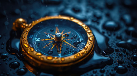 A compass with a gold ring and a blue face. The compass is pointing to the north. The compass is a symbol of direction and guidance
