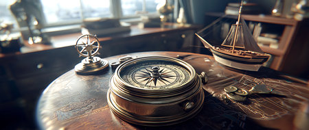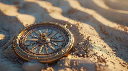 A close-up shot presents a classic brass compass atop a polished wooden surface. The scene is illuminated by warm sunlight, casting dramatic shadows and highlighting the intricate details of the compass. The image evokes a sense of exploration and navigation, suitable for various editorial and commercial applications.