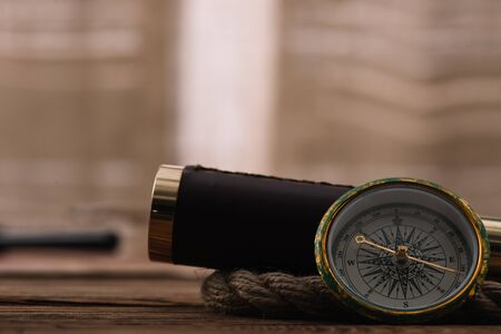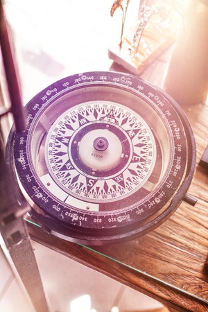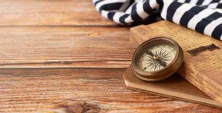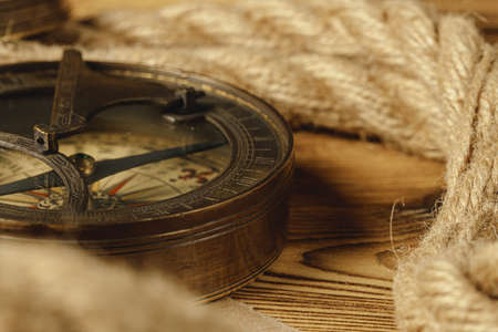 Magnetic compass on old brown wood. Vintage still life. Sailing accessories. Travel, navigation, collecting, souvenir, gift, graphic resources, copy space