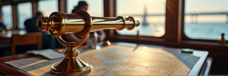 Antique brass telescope on map in sunlit room with ocean view. That the image is generated using AI.
