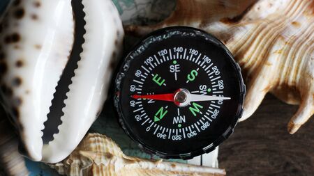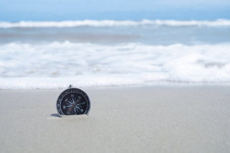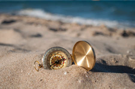 Compass with ocean waves on a sandy beach. The concept of world tourism day, Searching the right directions and Travel