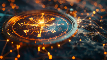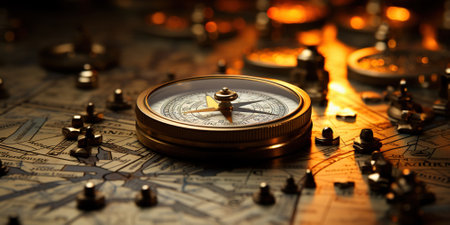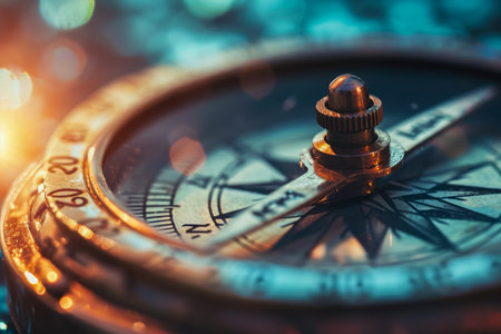 A close-up shot presents a compass, a navigation instrument. The compass features a metallic casing with a transparent face. Warm light illuminates the needle, set against a dark background, highlighting directional lines and elements. This image is suitable for use in business presentations, editorial content, and various illustrative projects.