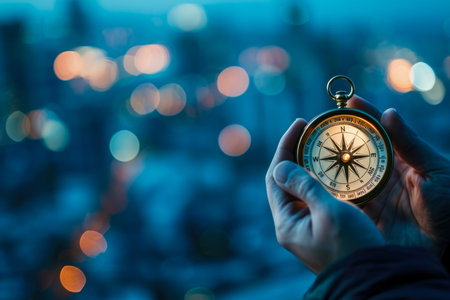 A golden compass glows with warm, inspirational light, pointing the way forward on a journey of discovery. This image symbolizes strategic direction, navigating future challenges, and finding purpose in business and lifes adventures.