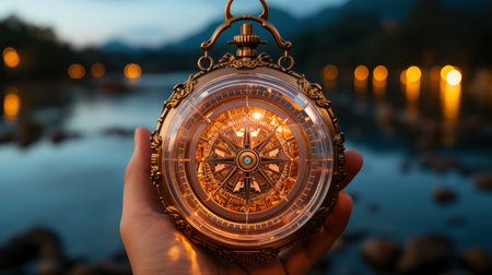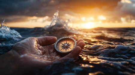 A hand holding a compass in the ocean. Concept of adventure and exploration, as the compass is a symbol of navigation and direction. The ocean setting adds to the feeling of being on a journey