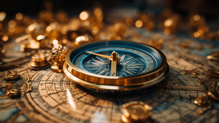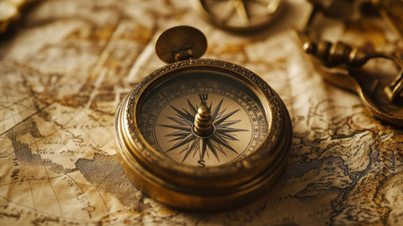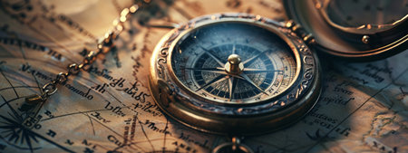 A vintage brass compass placed on an antique map, softly lit to evoke a sense of adventure and exploration, perfect for travel or history themes.