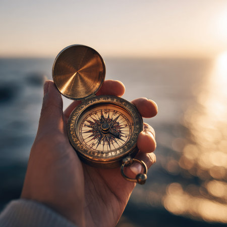 A hand holds a brass compass, its details sharply focused against a soft, blurred backdrop of ocean and sky. Warm sunlight illuminates the scene, highlighting the texture of the compass. This image suggests themes of guidance and exploration, potentially suitable for travel or navigational concepts.