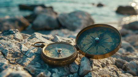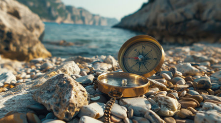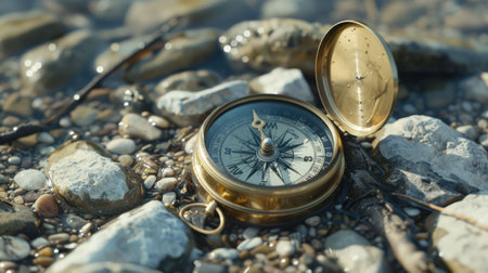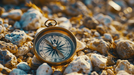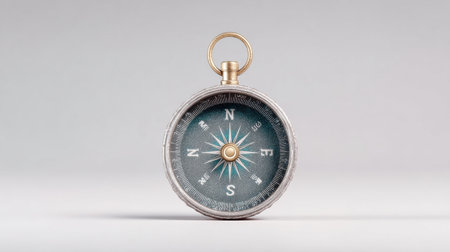 An old, brass compass rests on a weathered surface, its needle steady and pointing north.