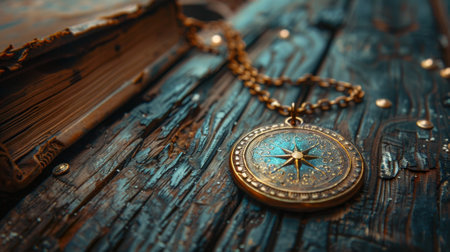an enigmatic amulet rests on an old wooden table, evoking mystical energy with room for text
