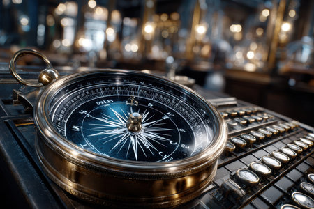 Vintage nautical instrument panel with analog displays and compass. That the image is generated using AI.