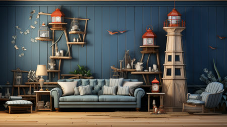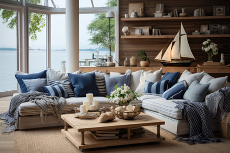 Nautical Escape: A coastal-themed living room with striped upholstery, weathered wood, and nautical accents. Generative AI
