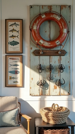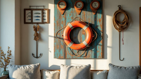 Nautical-themed decor with lifebuoy, rope, and fishing hooks in sunlit room. That the image is generated using AI.
