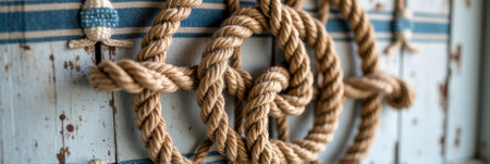 Nautical ropes on weathered wooden wall with blue stripes.