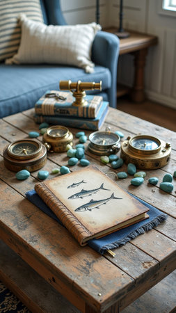 Nautical-themed living room with compass decor and sketchbook on wooden table.