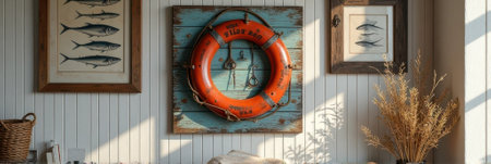 Nautical themed wall decor with lifebuoy and fish art in rustic frame. That the image is generated using AI.