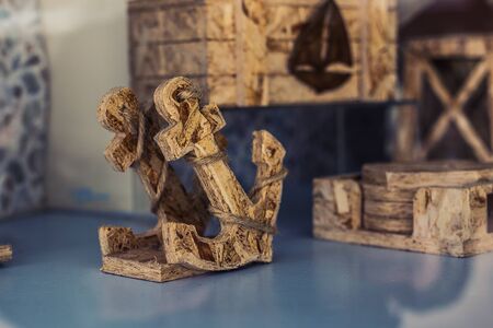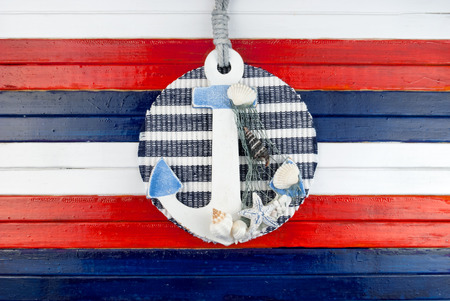 Decorative anchor in marine composition on a colored wooden background.