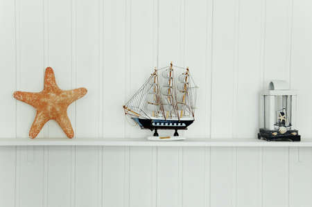 Marine style in the interior of the house. Shelf with decor on a white wall.