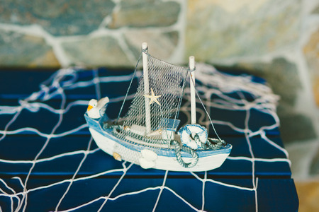 the toy ship with a wattled network lie on a blue shop