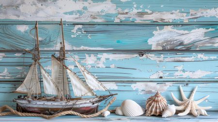 an antique sailing boat toy model surrounded by ship, rope, and seashells on a serene white and blue wooden background, offering a nautical ambiance and ample empty space for text